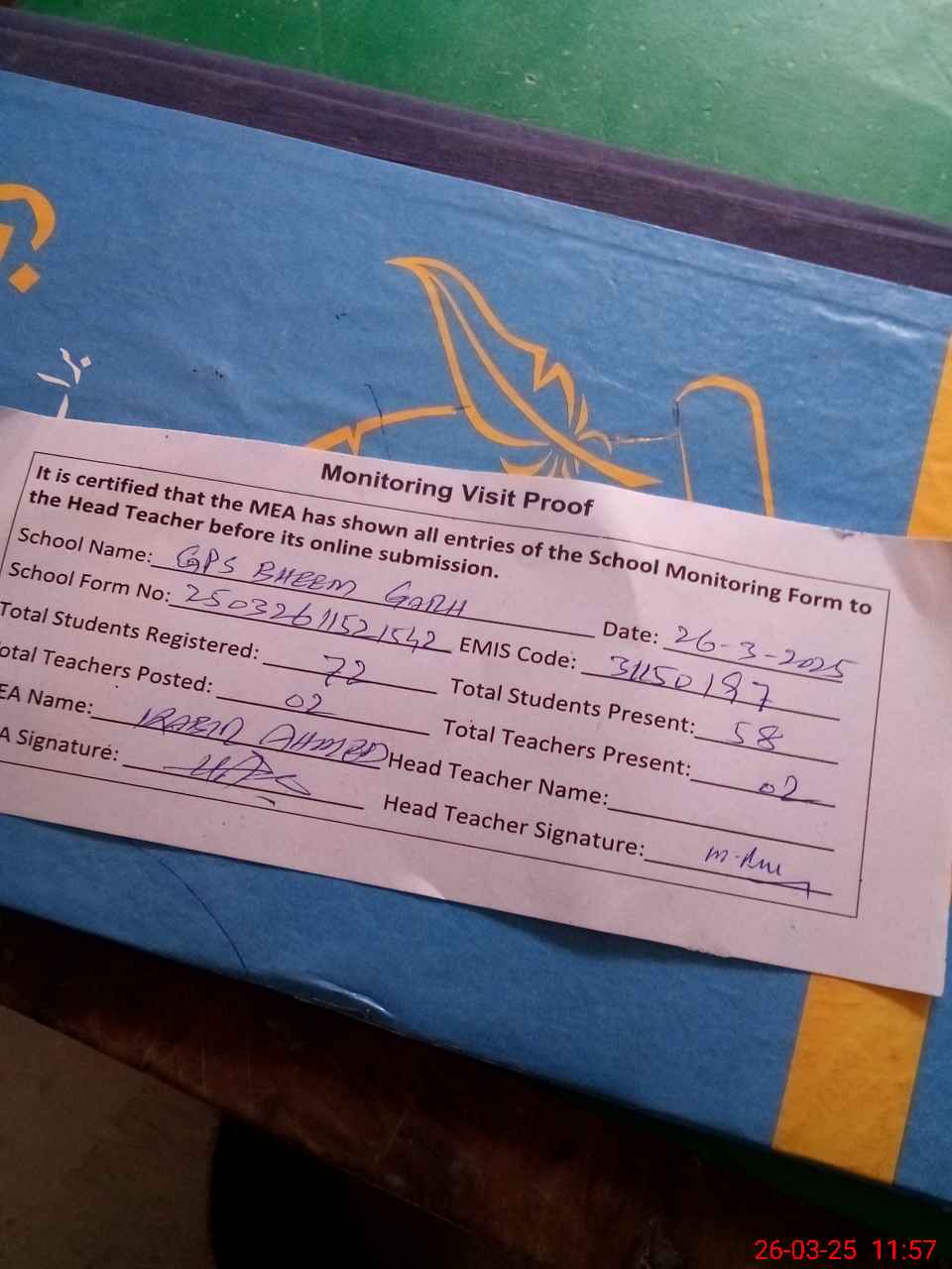 | Attendance Register | Head Teacher | MEA with School | Visit Proof |