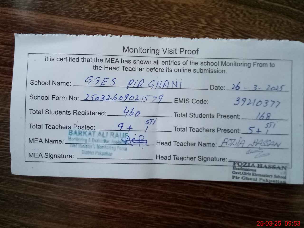 | Remarks (Use Separate Page if Required): Sadra yaqoob STI is present in school No AEO visit from December 2024 to till visit D4 books record not shown FTF record incomplete | |||||
