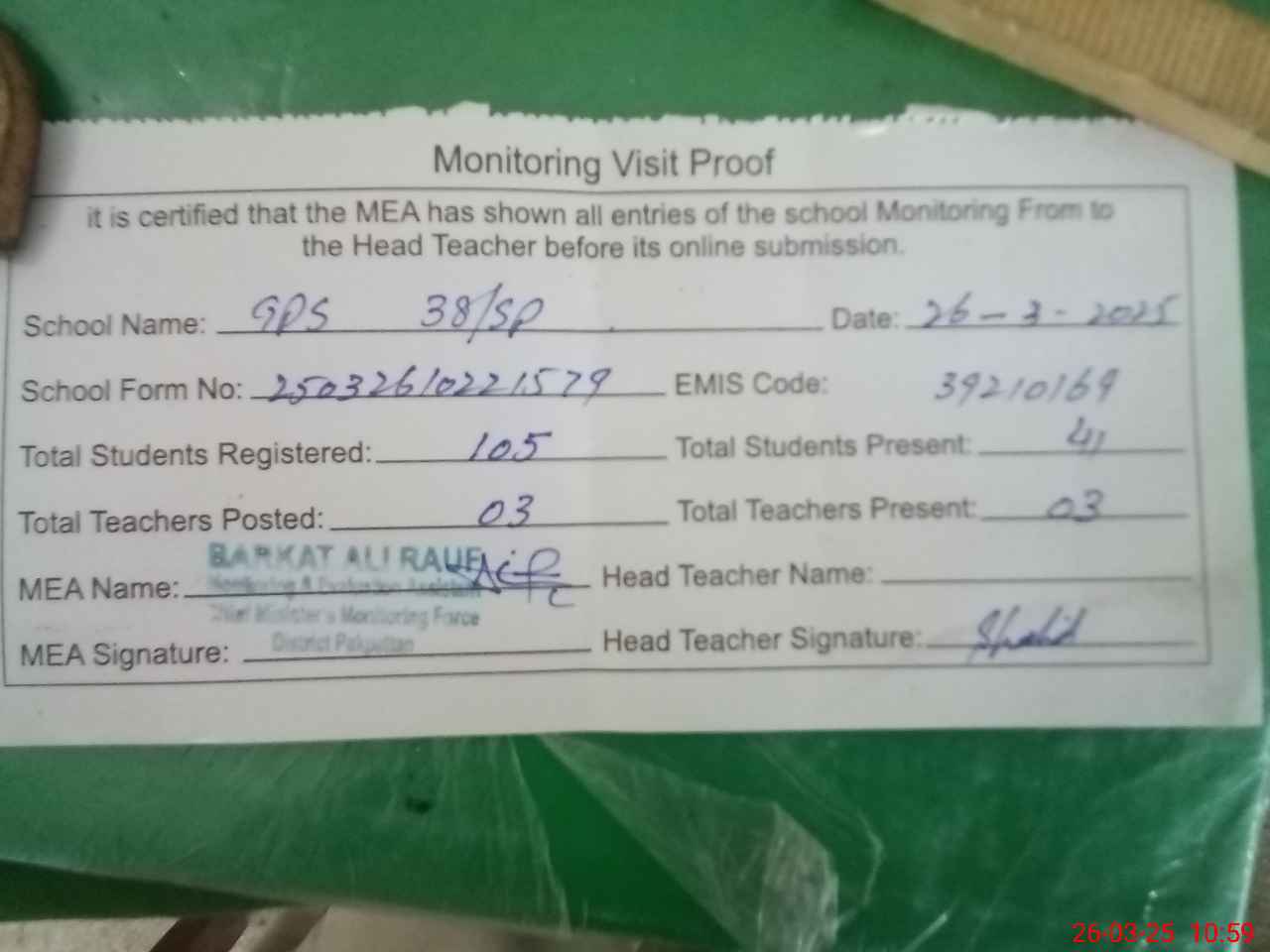 | Attendance Register | Head Teacher | MEA with School | Visit Proof |