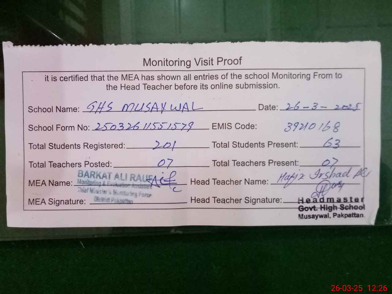 | EMIS Code: 39210168 | Name of School: GHS MUSAY WAL P/O 39/SP PAKPATTAN | |||