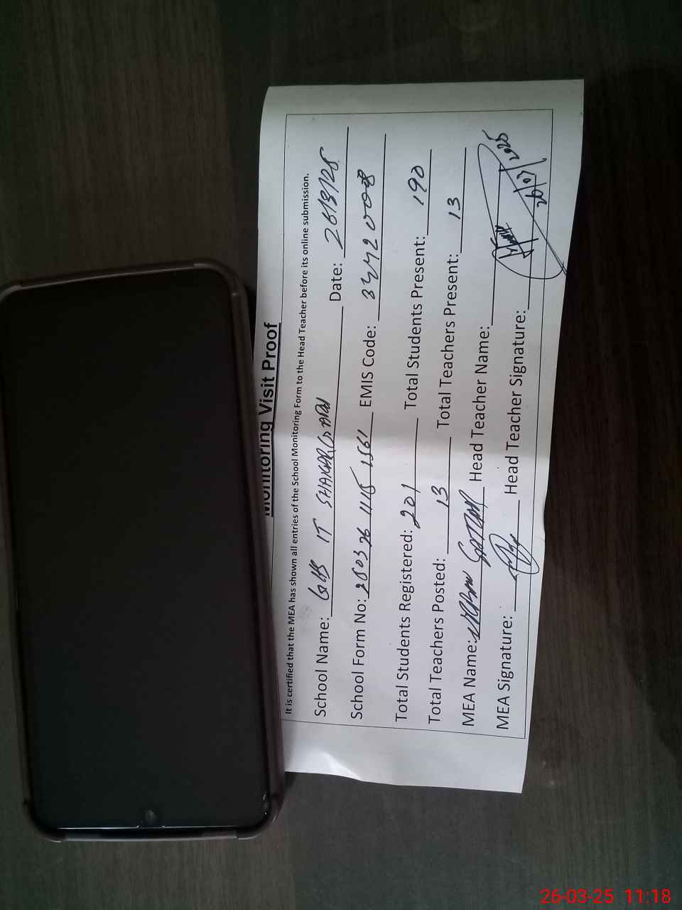 | Attendance Register | Head Teacher | MEA with School | Visit Proof |