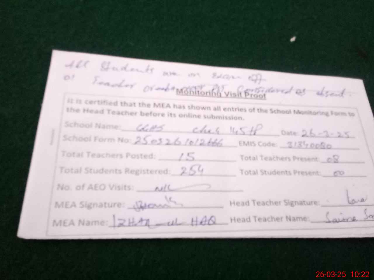| Attendance Register | Head Teacher | MEA with School | Visit Proof |