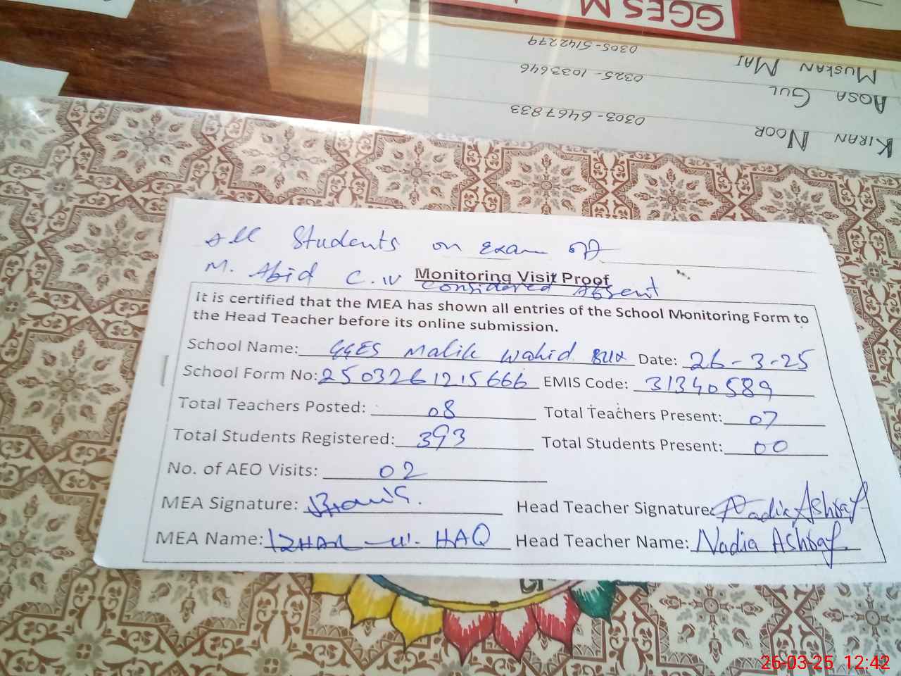 | Attendance Register | Head Teacher | MEA with School | Visit Proof |