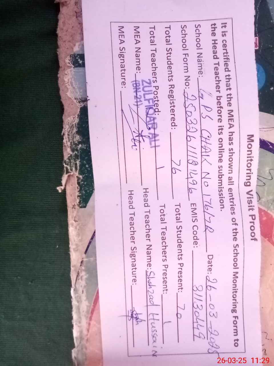 | Attendance Register | Head Teacher | MEA with School | Visit Proof |