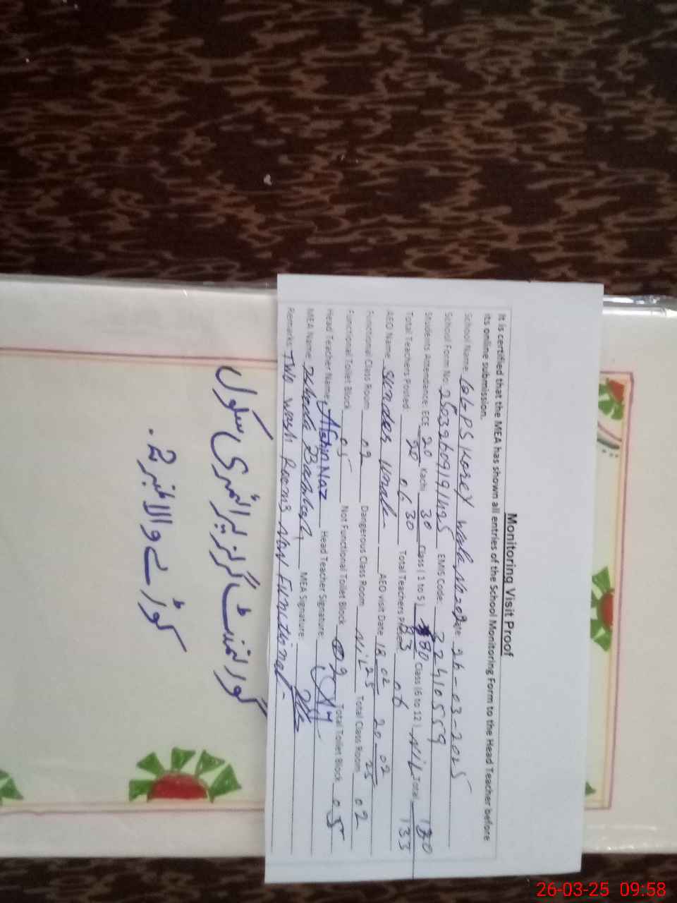 | Certified that this School was Inspected by the Undersigned MEA/DMO Today and the Information Stated Above is as Per Record. | |||||