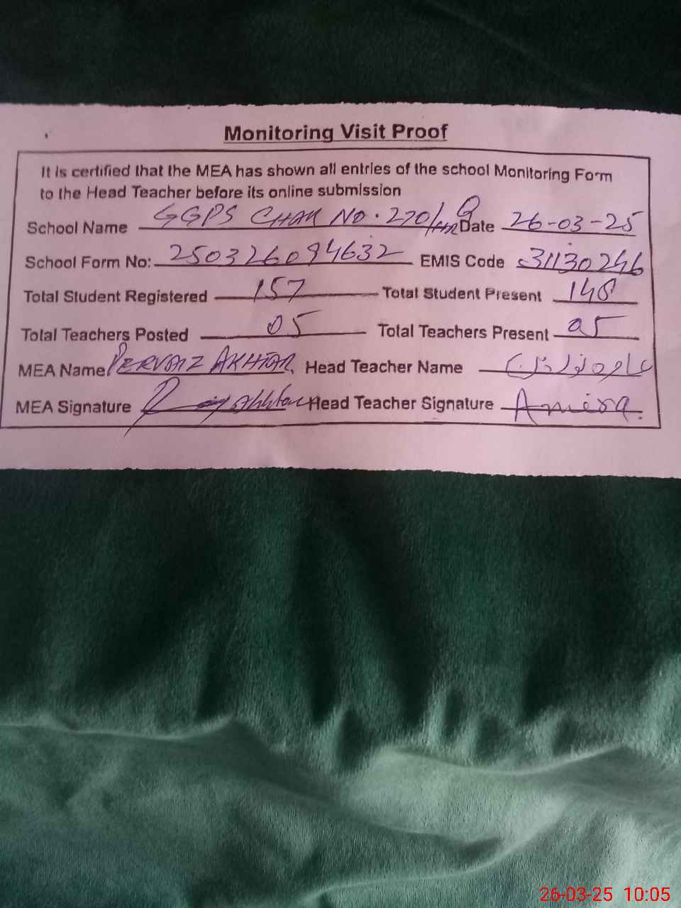 | Attendance Register | Head Teacher | MEA with School | Visit Proof |