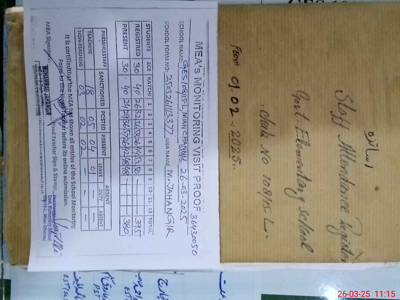| Attendance Register | Head Teacher | MEA with School | Visit Proof |