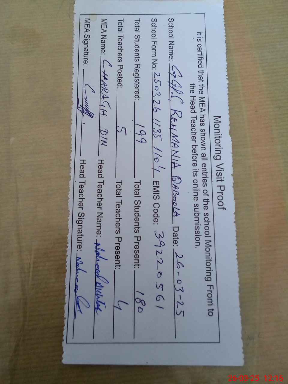 | EMIS Code: 39220561 | Name of School: GGPS REHMANIA QABOOLA | |||