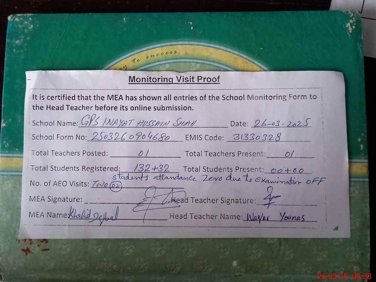 | EMIS Code: 31330328 | Name of School: GPS INAYAT HUSSIAN SHAH | |||