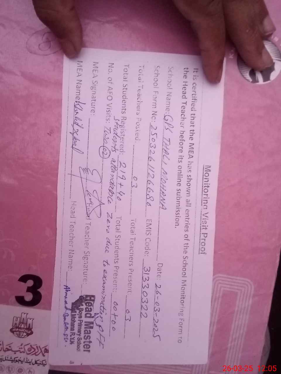 | Remarks (Use Separate Page if Required): Class verification is not updated on mea tab as per sis and teachers attendance not updated on sis today and school has insaf afternoon classes with students strength 40 and students attendance zero due to examination off and two STI teachers are present in the school | |||||