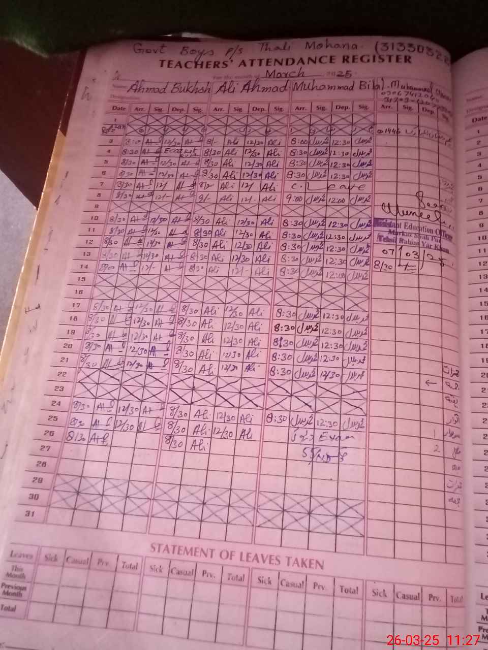 | 31**** | Mu**** Bi**** Gh**** | Contract | 0 | 5 | 0 | 0 | 0 | 0 | 0 | 0 | 0 | Exam Duty | |