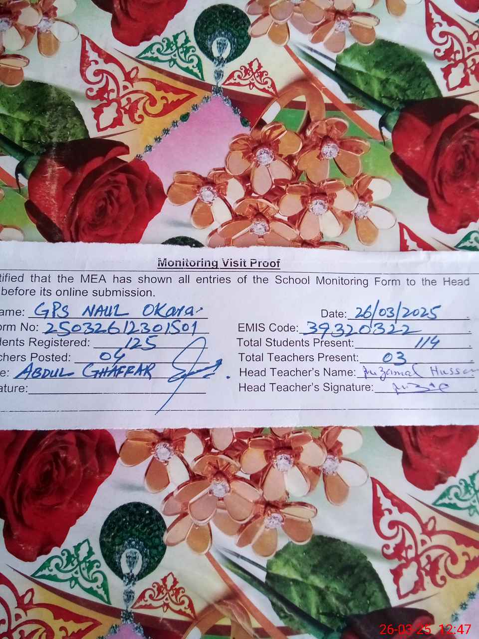 | Name: MU**** HU**** Designation: (School Headmaster's/Headmistress's) PTC/JV Phone/Cell Number: 03**** |