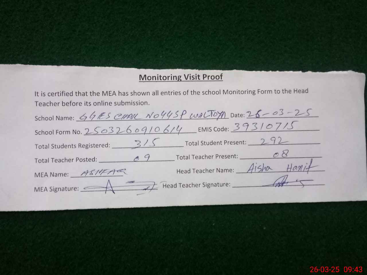 | EMIS Code: 39310715 | Name of School: GGES CHAK NO. 44/SP WALTOYA | |||