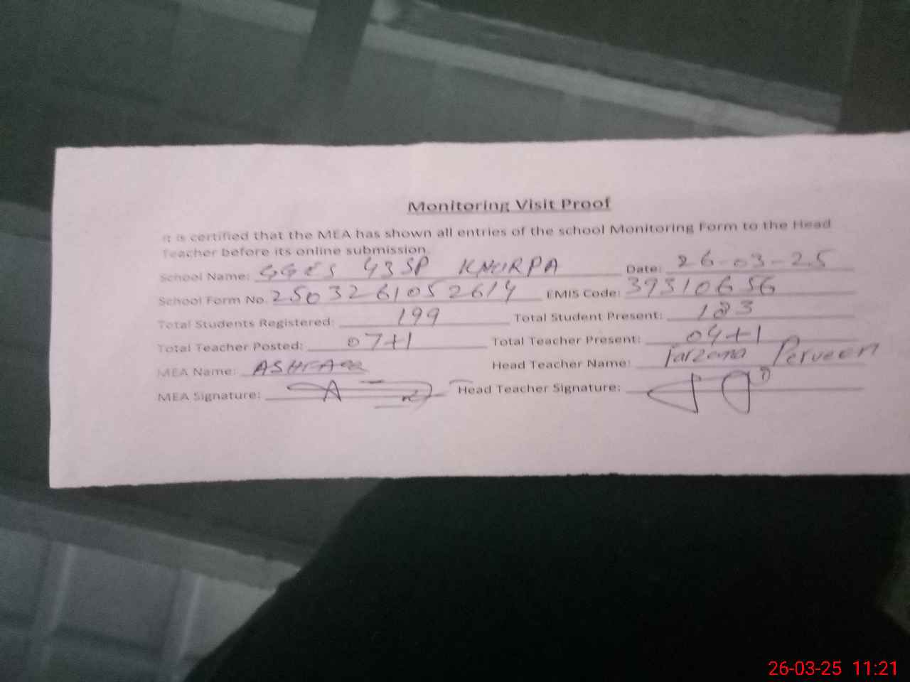 | Attendance Register | Head Teacher | MEA with School | Visit Proof |