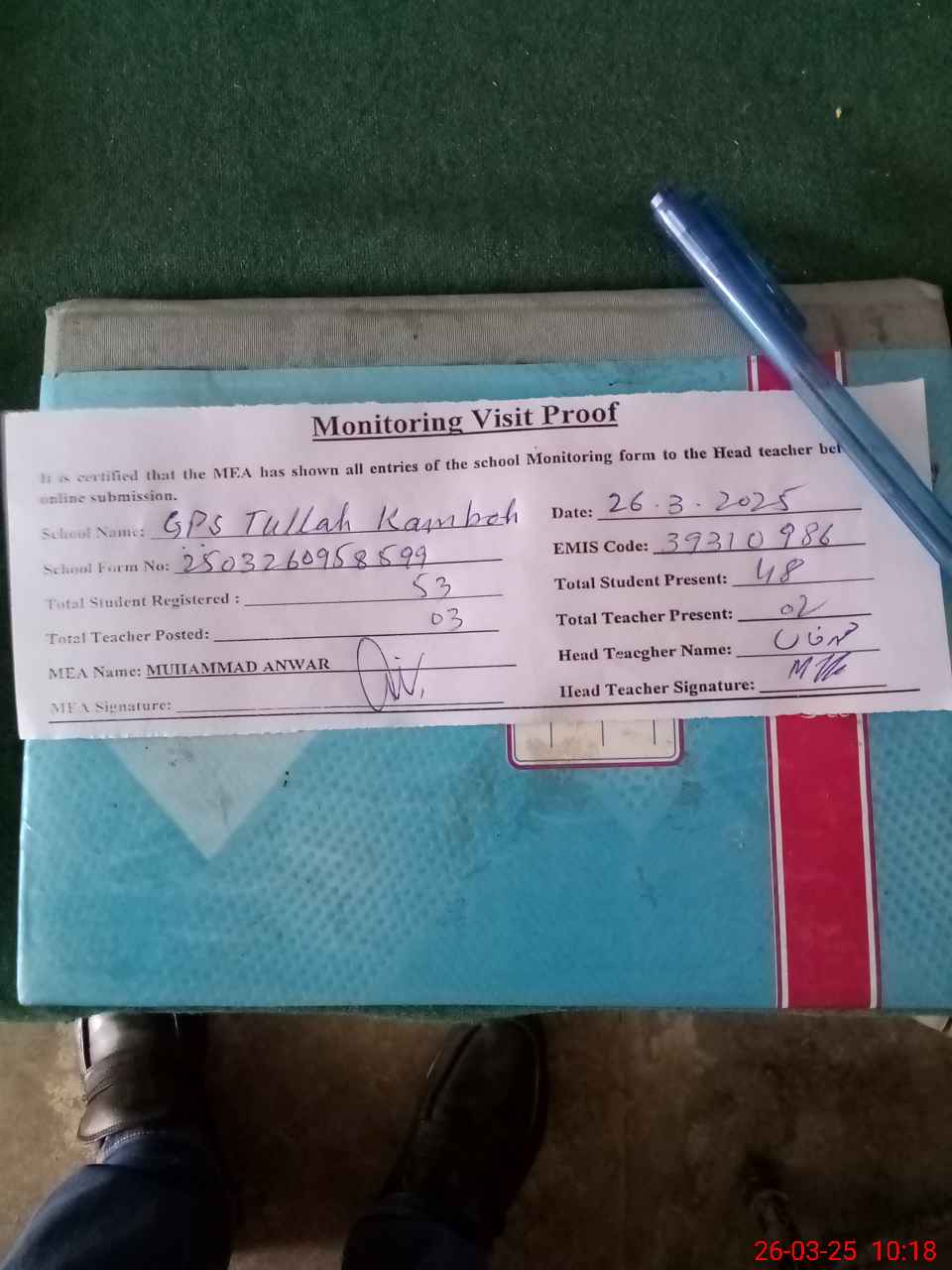 | Attendance Register | Head Teacher | MEA with School | Visit Proof |