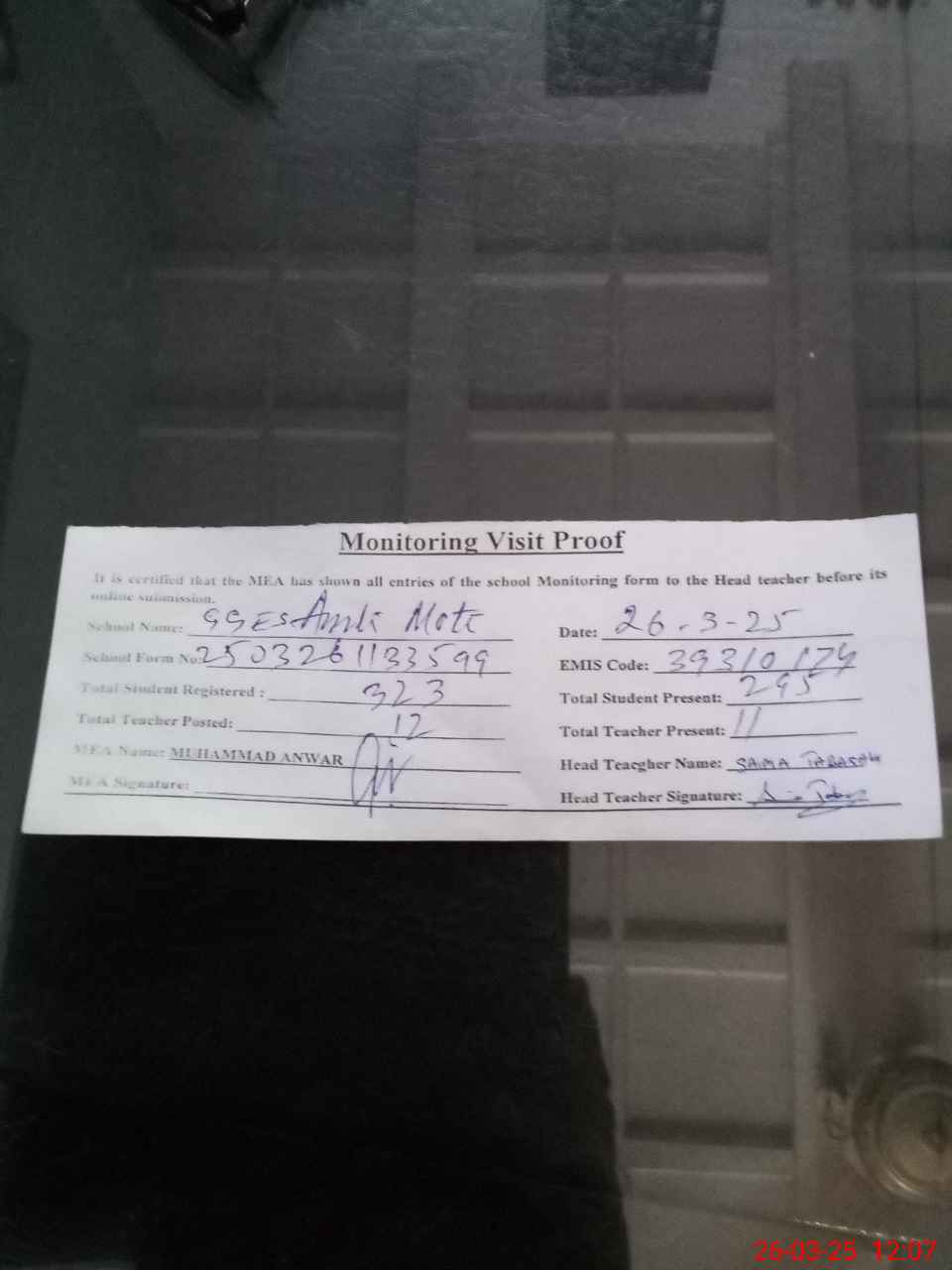 | Attendance Register | Head Teacher | MEA with School | Visit Proof |