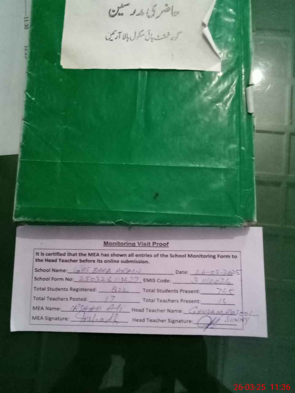 | Attendance Register | Head Teacher | MEA with School | Visit Proof |