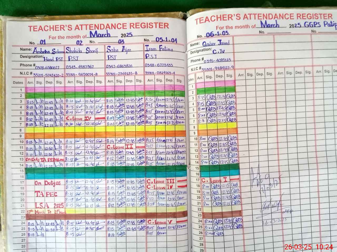 | CNIC | Full Name | Designation | R/C | Absence During Last Calender Month |