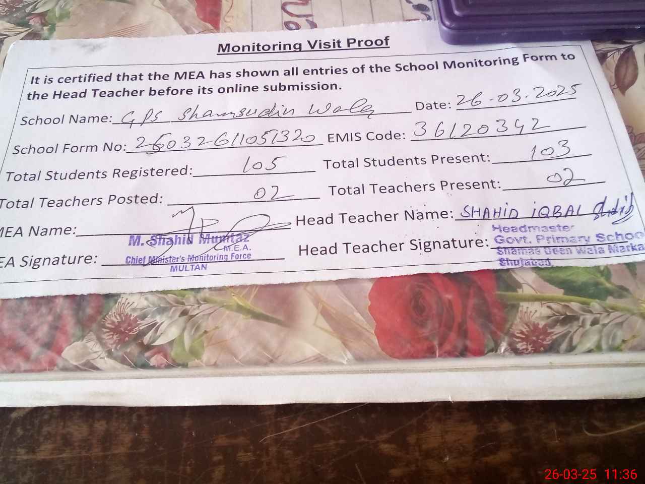 | Attendance Register | Head Teacher | MEA with School | Visit Proof |