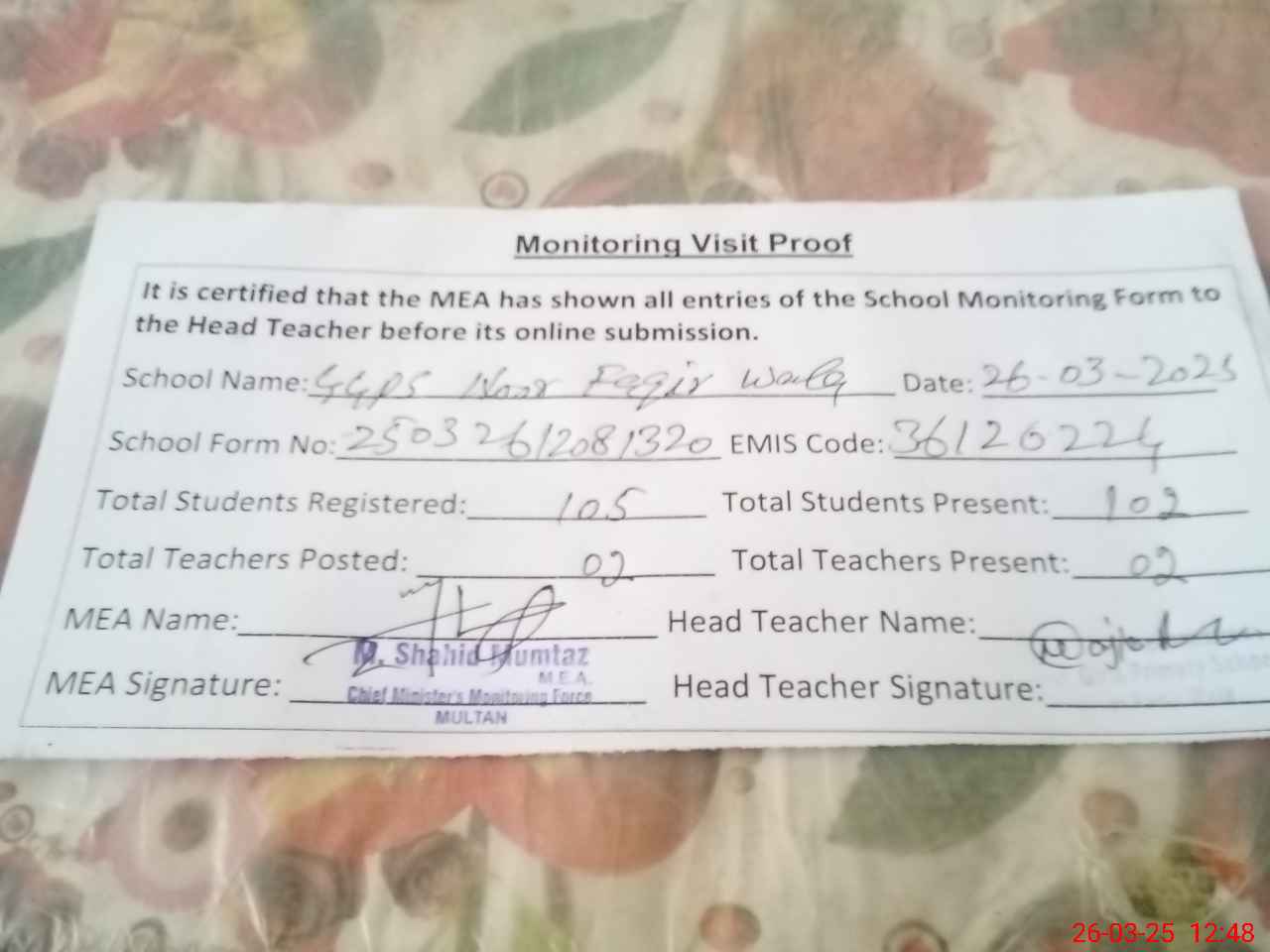 | Certified that this School was Inspected by the Undersigned MEA/DMO Today and the Information Stated Above is as Per Record. | |||||