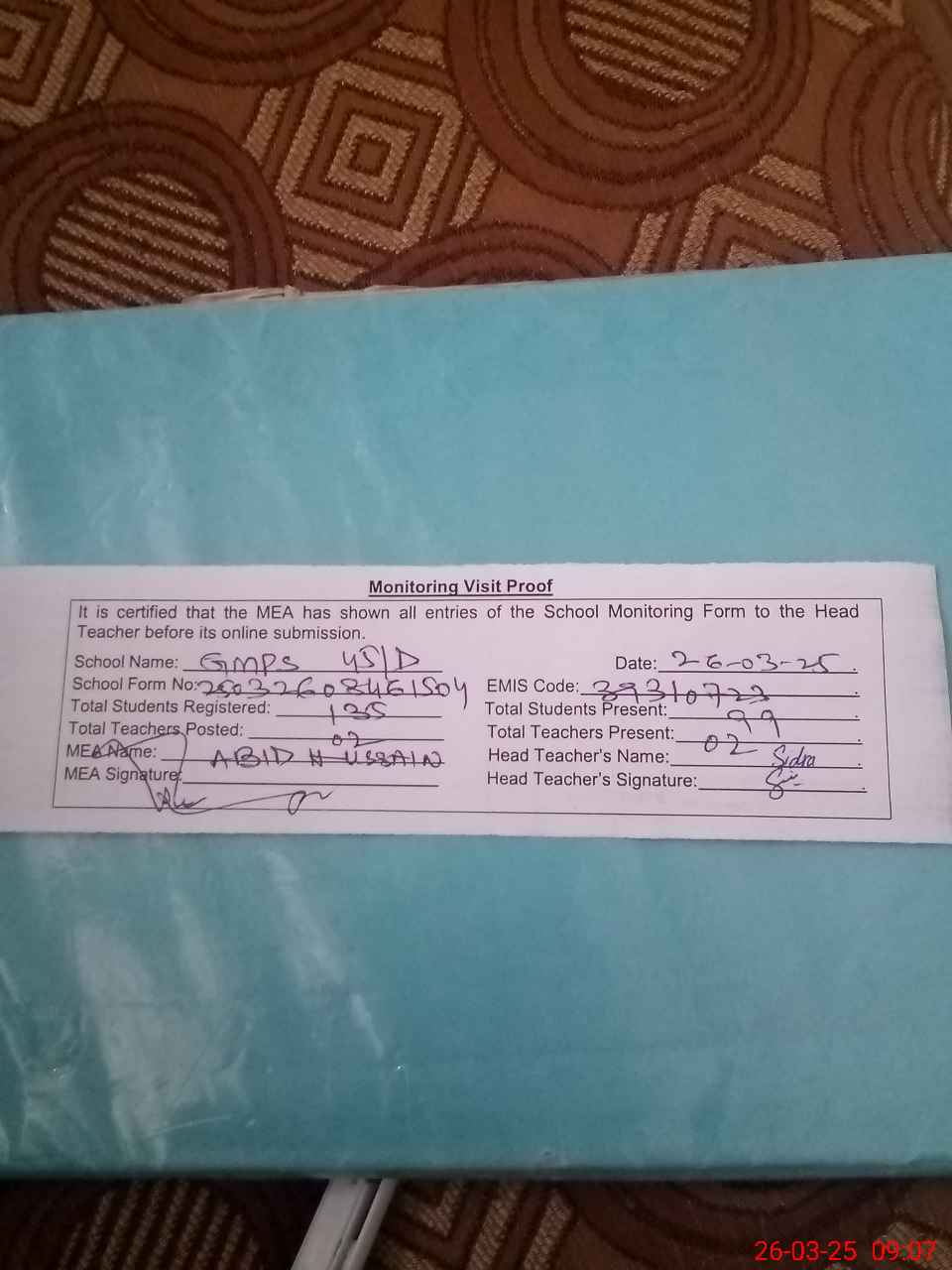 | Attendance Register | Head Teacher | MEA with School | Visit Proof |