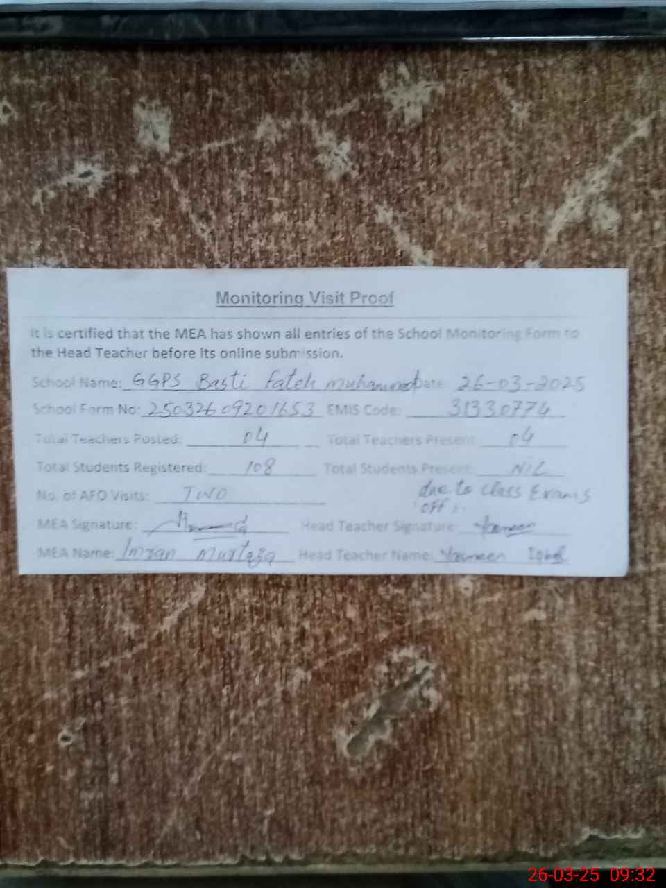 | Attendance Register | Head Teacher | MEA with School | Visit Proof |