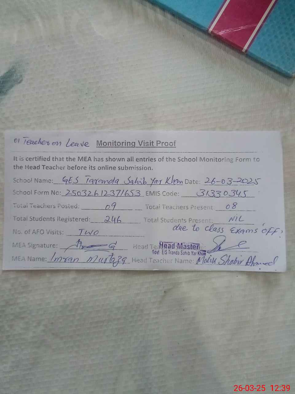 | Attendance Register | Head Teacher | MEA with School | Visit Proof |