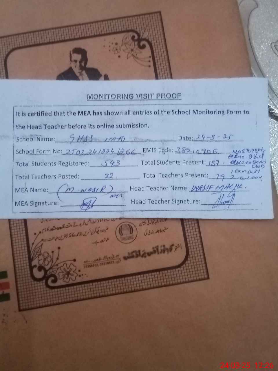 | Certified that this School was Inspected by the Undersigned MEA/DMO Today and the Information Stated Above is as Per Record. | |||||