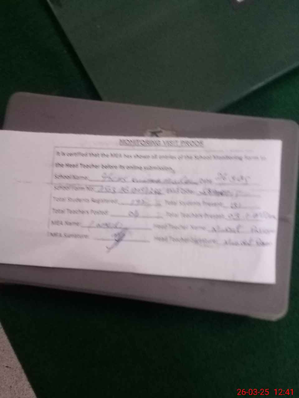 | Attendance Register | Head Teacher | MEA with School | Visit Proof |