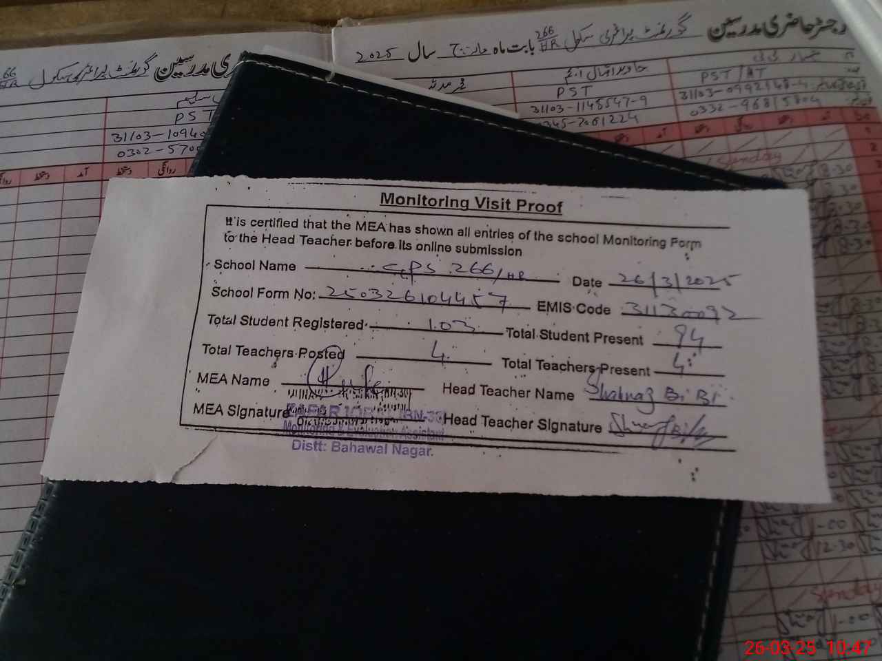 | Attendance Register | Head Teacher | MEA with School | Visit Proof |