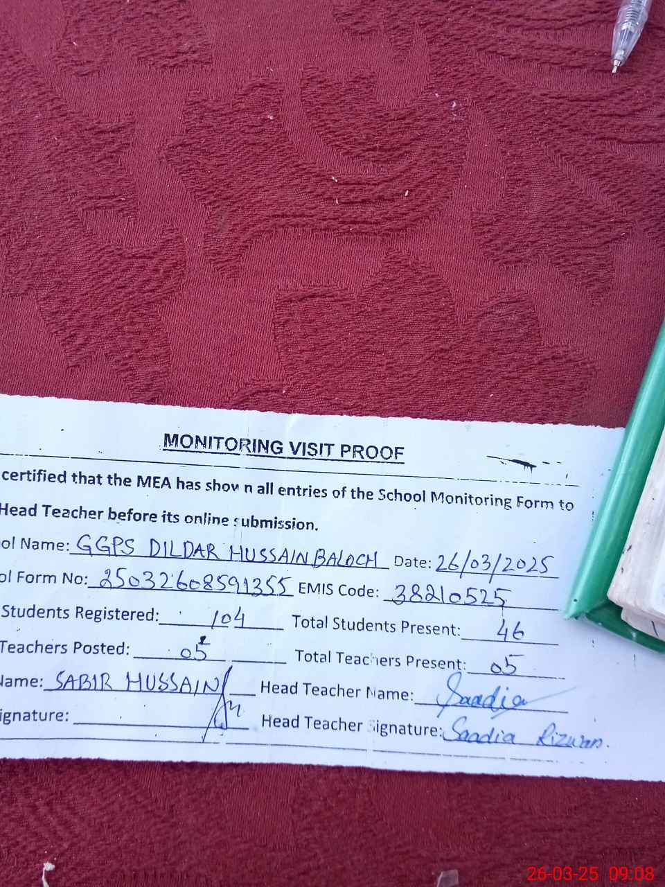 | Attendance Register | Head Teacher | MEA with School | Visit Proof |