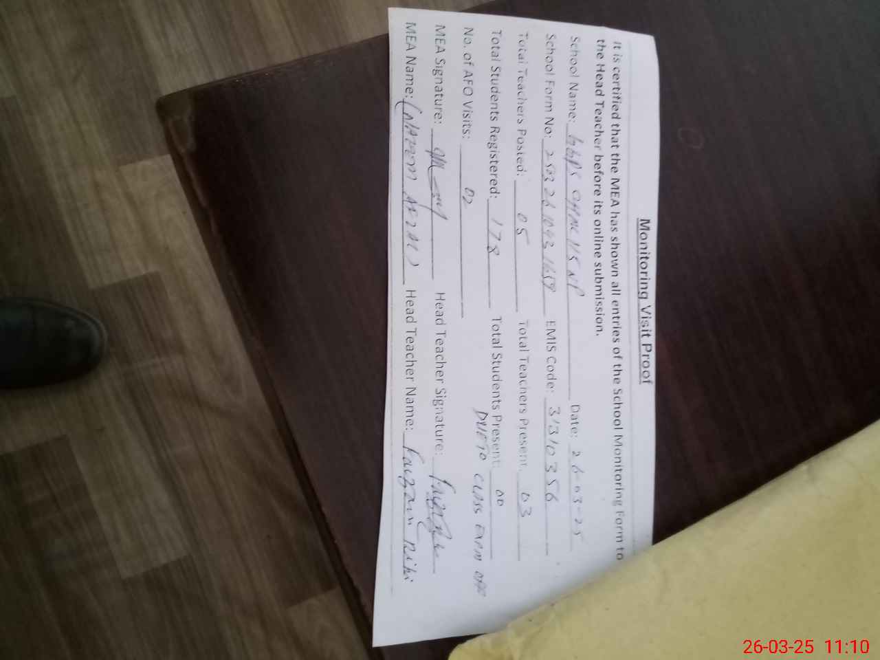 | Attendance Register | Head Teacher | MEA with School | Visit Proof |