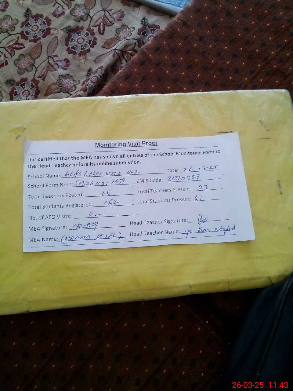 | Attendance Register | Head Teacher | MEA with School | Visit Proof |