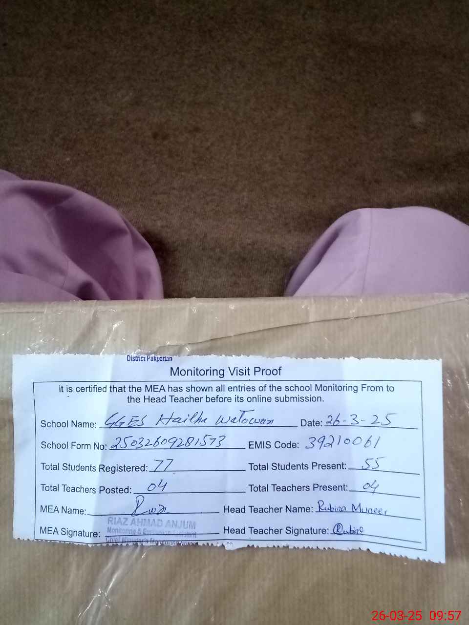 | Attendance Register | Head Teacher | MEA with School | Visit Proof |