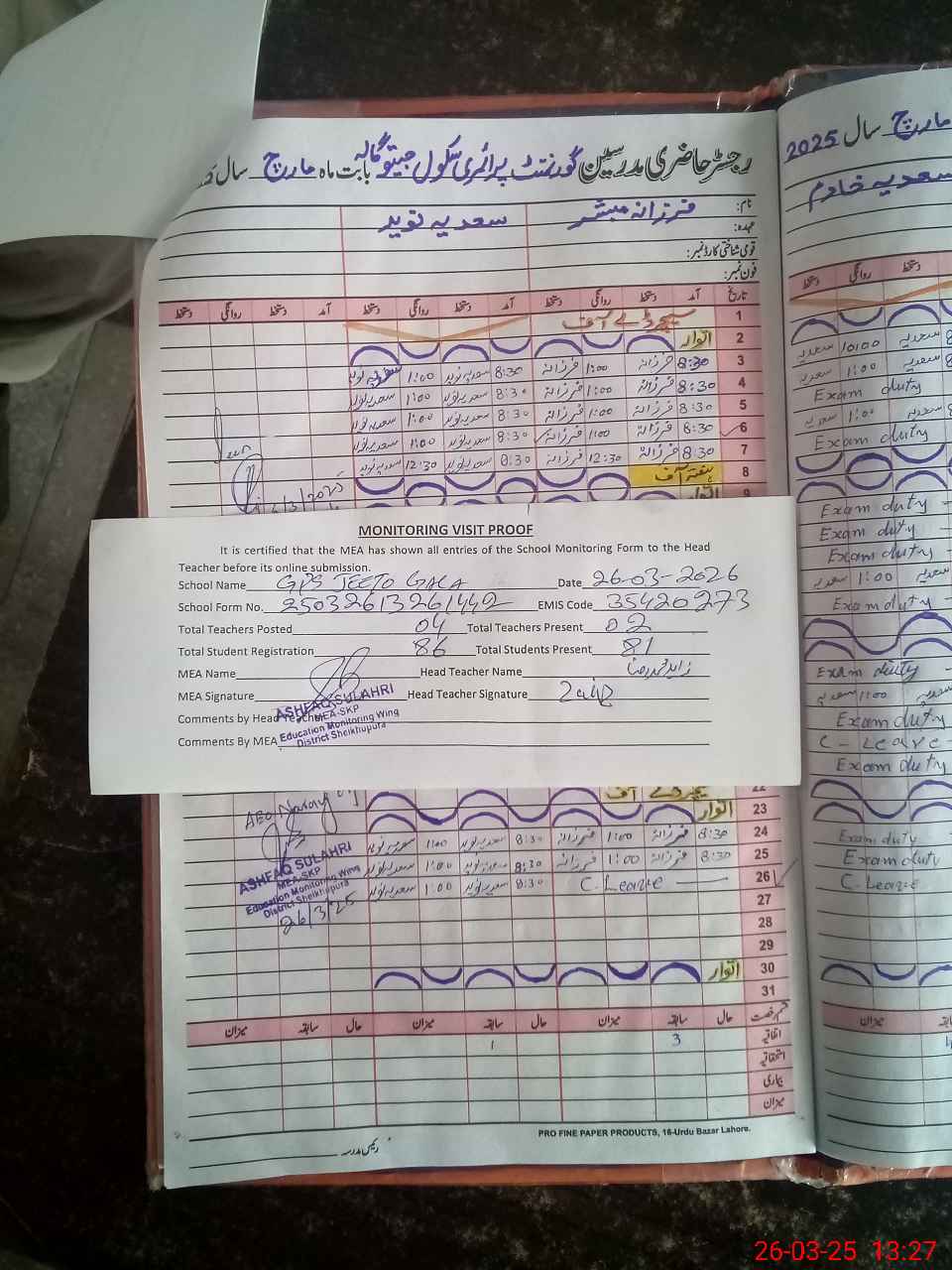| Attendance Register | Head Teacher | MEA with School | Visit Proof |