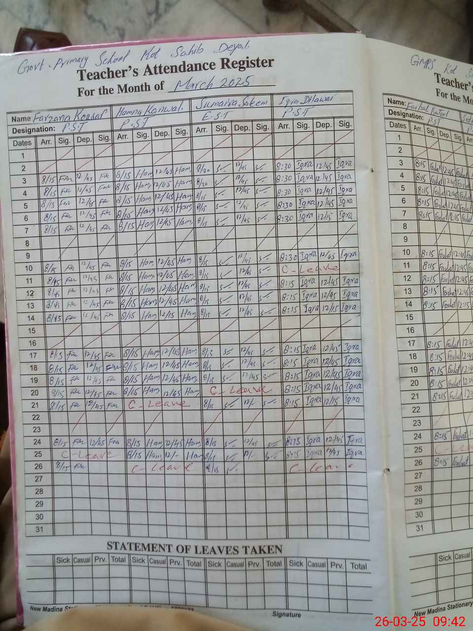 | Leave | Duty | Absent | Maternity | Medical | Ex- Pak |