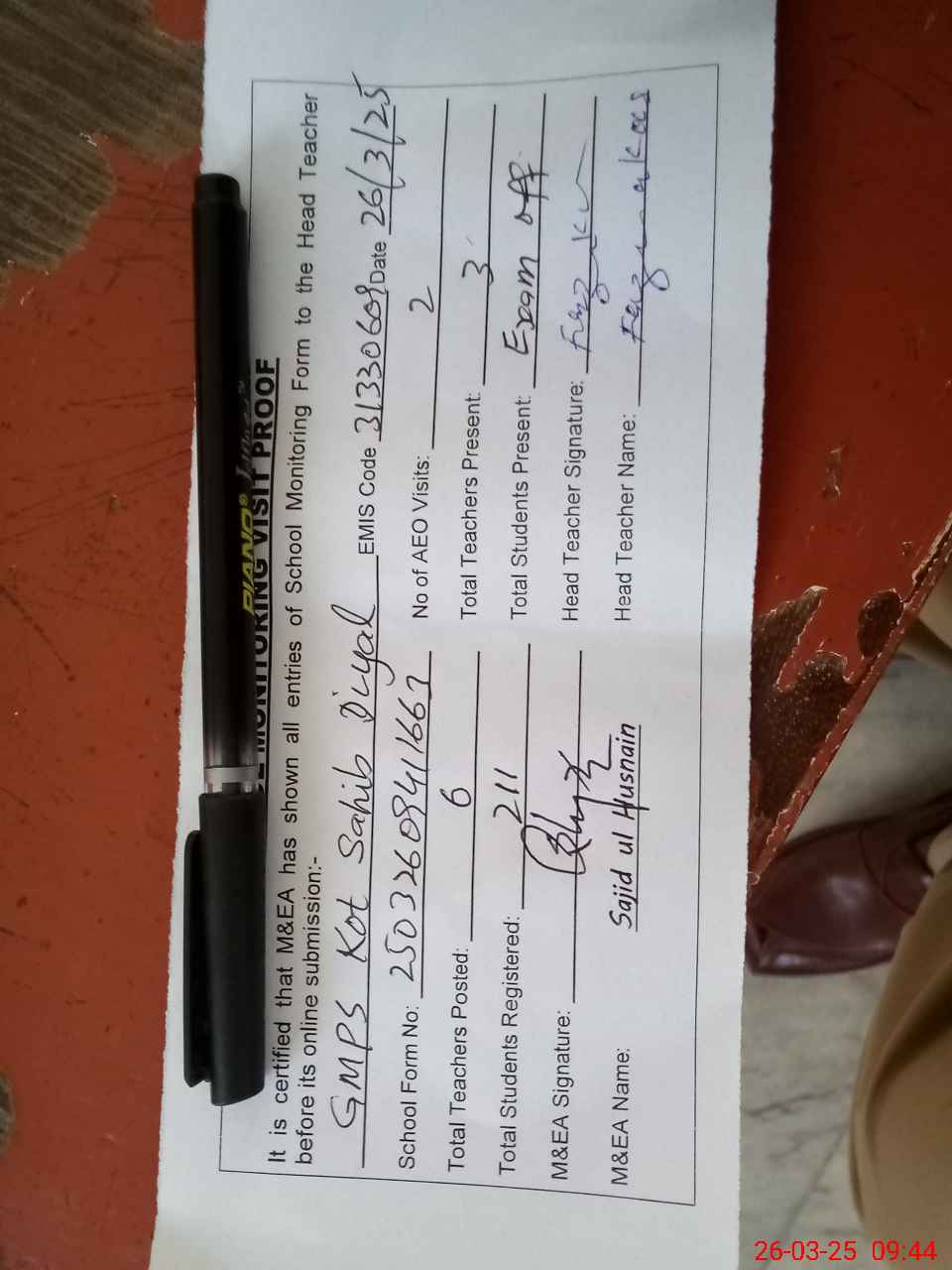 | Attendance Register | Head Teacher | MEA with School | Visit Proof |