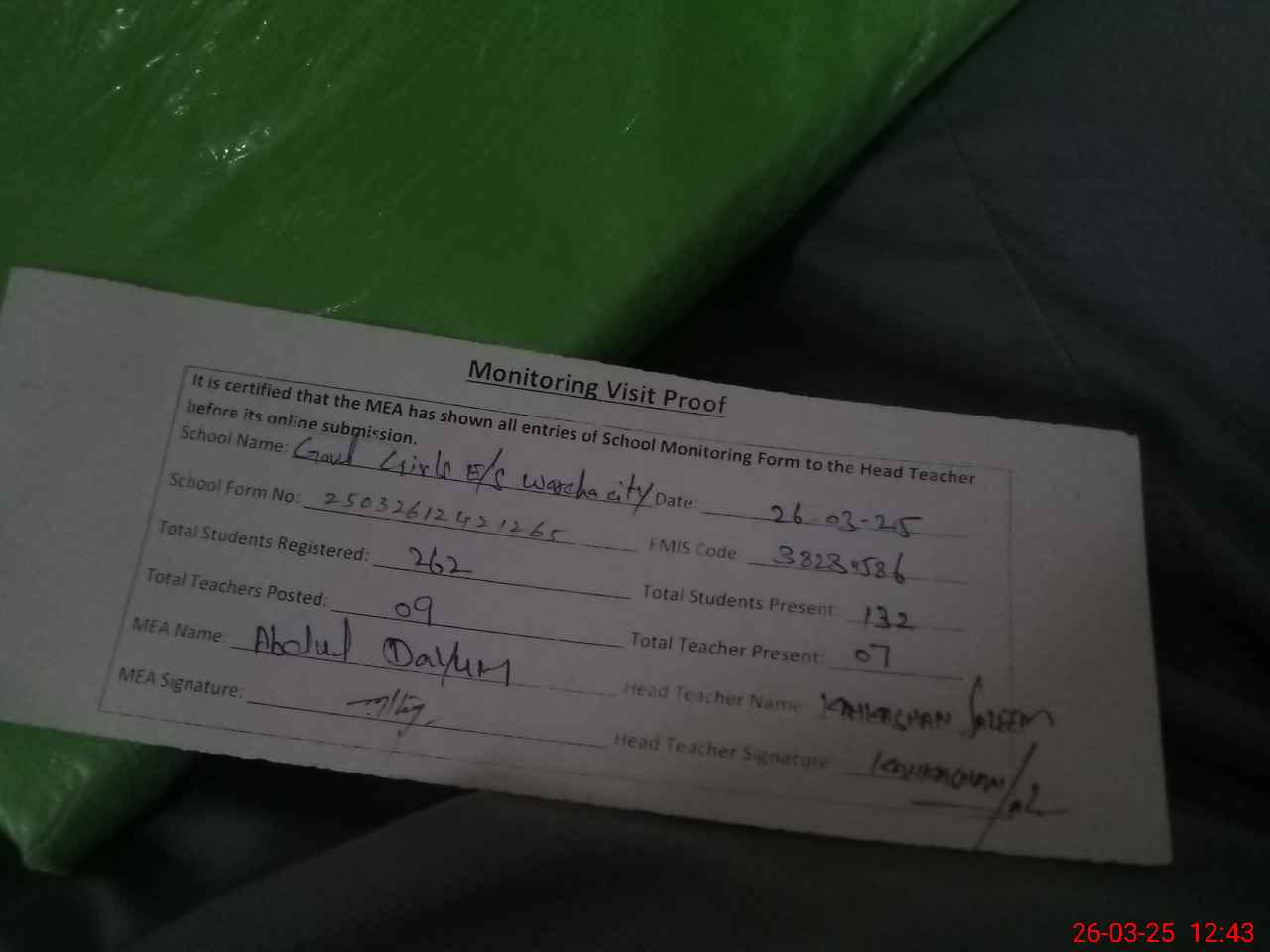 | Attendance Register | Head Teacher | MEA with School | Visit Proof |