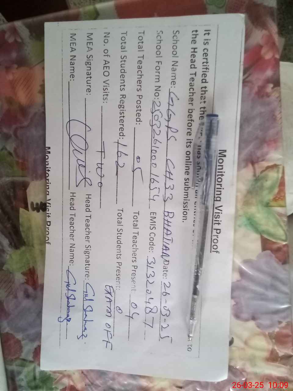 | Attendance Register | Head Teacher | MEA with School | Visit Proof |