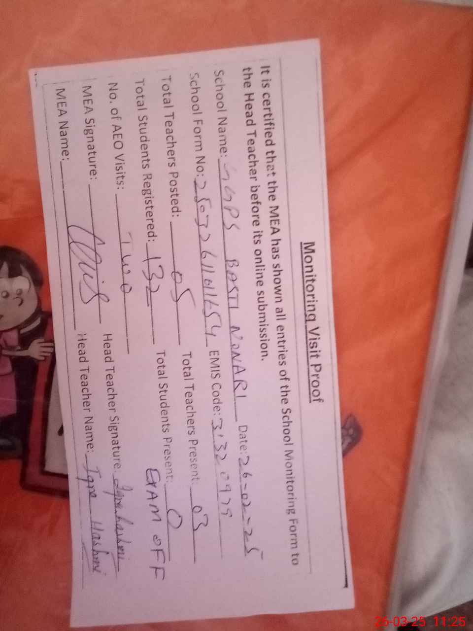 | Attendance Register | Head Teacher | MEA with School | Visit Proof |
