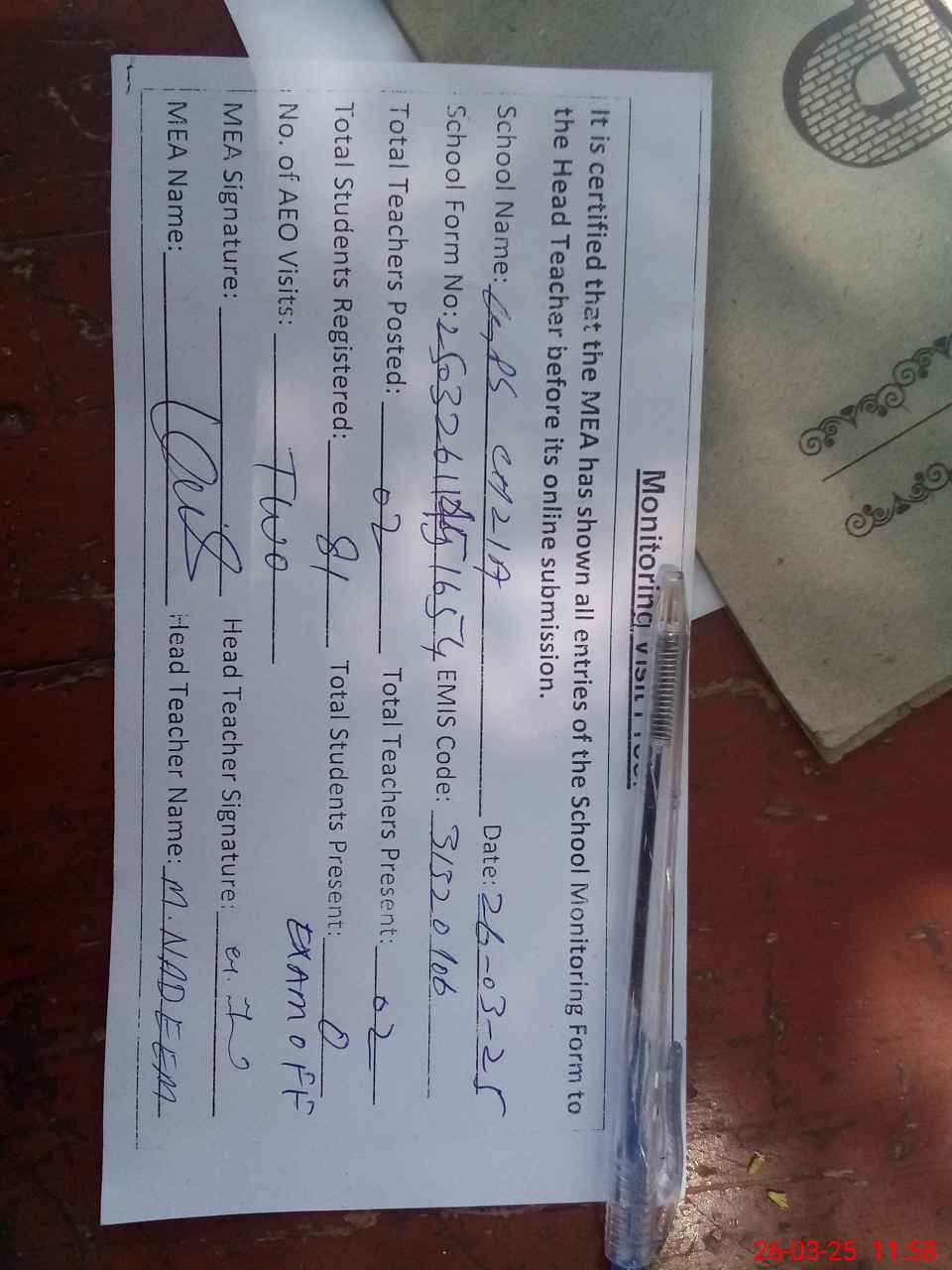 | Attendance Register | Head Teacher | MEA with School | Visit Proof |