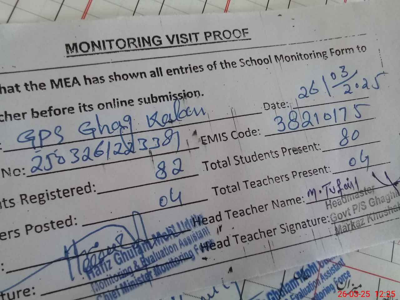 | Attendance Register | Head Teacher | MEA with School | Visit Proof |