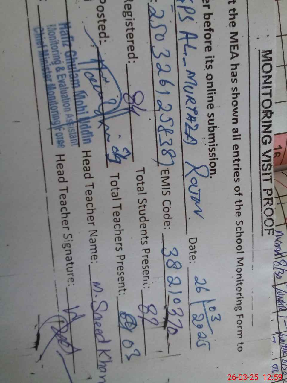 | EMIS Code: 38210370 | Name of School: GPS AL MURTAZA RAJAR | |||