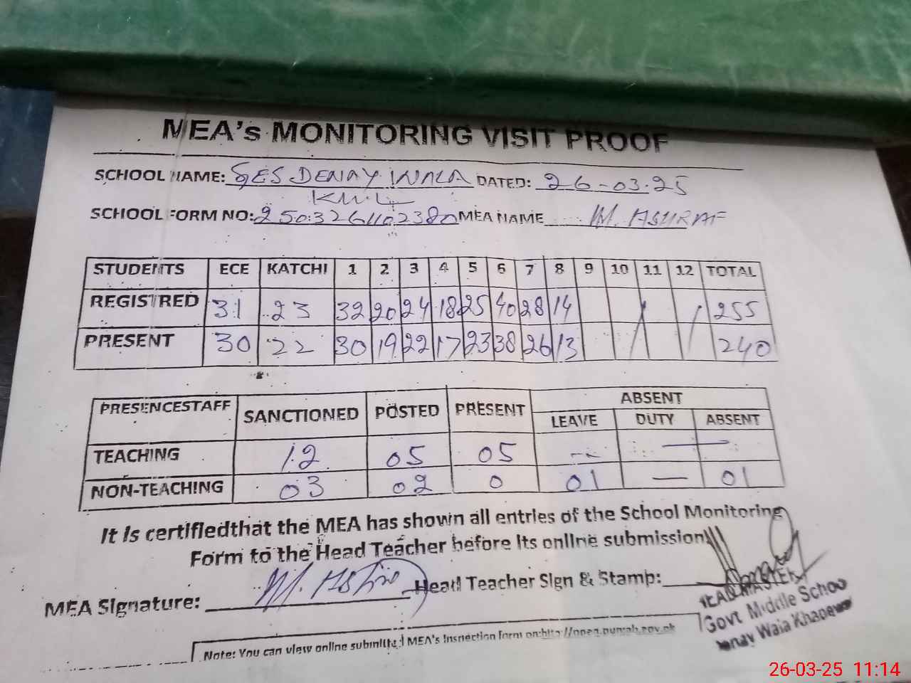| EMIS Code: 36420072 | Name of School: GES DENAY WALA, KHANEWAL | |||