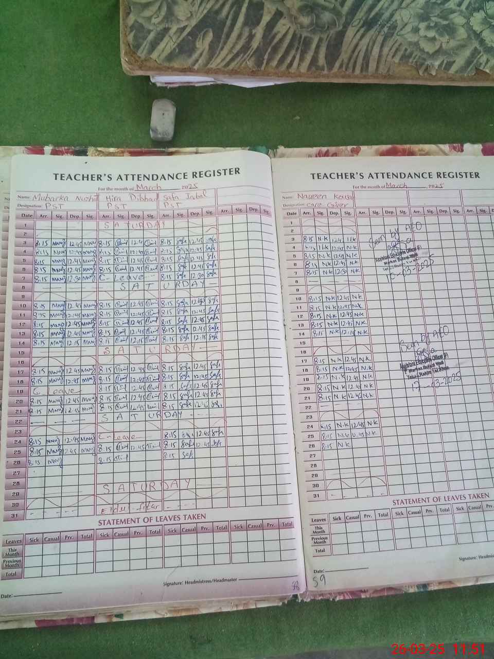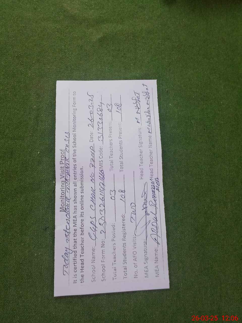 | Attendance Register | Head Teacher | MEA with School | Visit Proof |