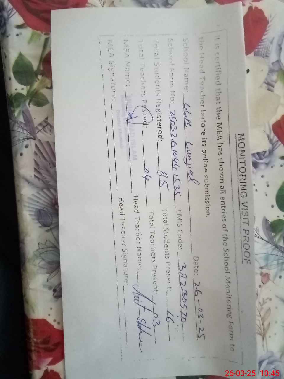 | Attendance Register | Head Teacher | MEA with School | Visit Proof |