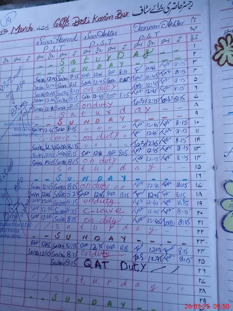 | Leave | Duty | Absent | Maternity | Medical | Ex- Pak |