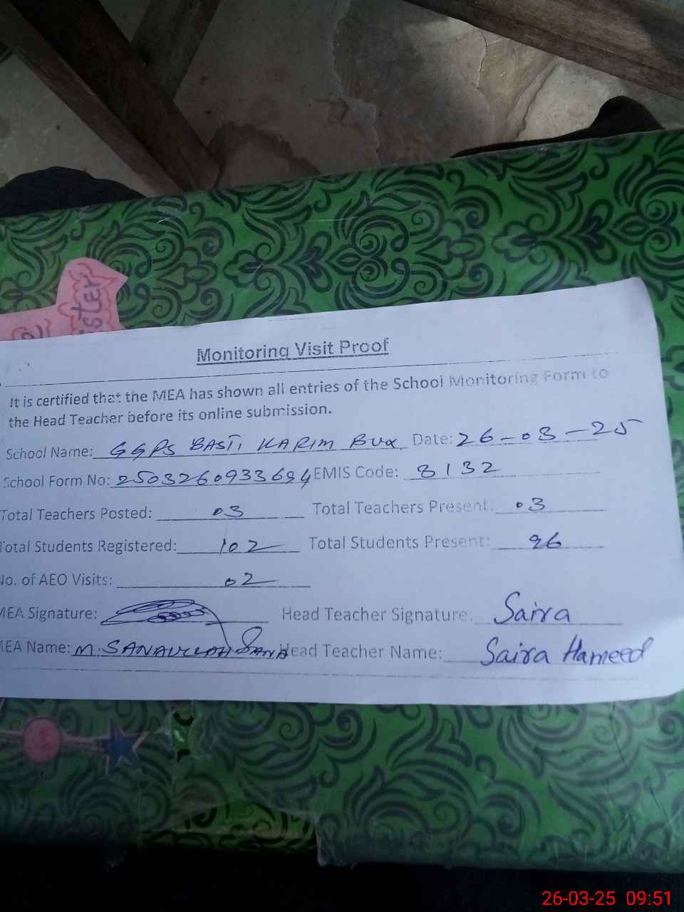| Monitoring Date: 26-03-2025 | Start Time: 26-03-2025 09:33 AM | End Time: 26-03-2025 09:51 AM | Name of MEA: Mu**** Sa**** Ul**** Sa**** | |