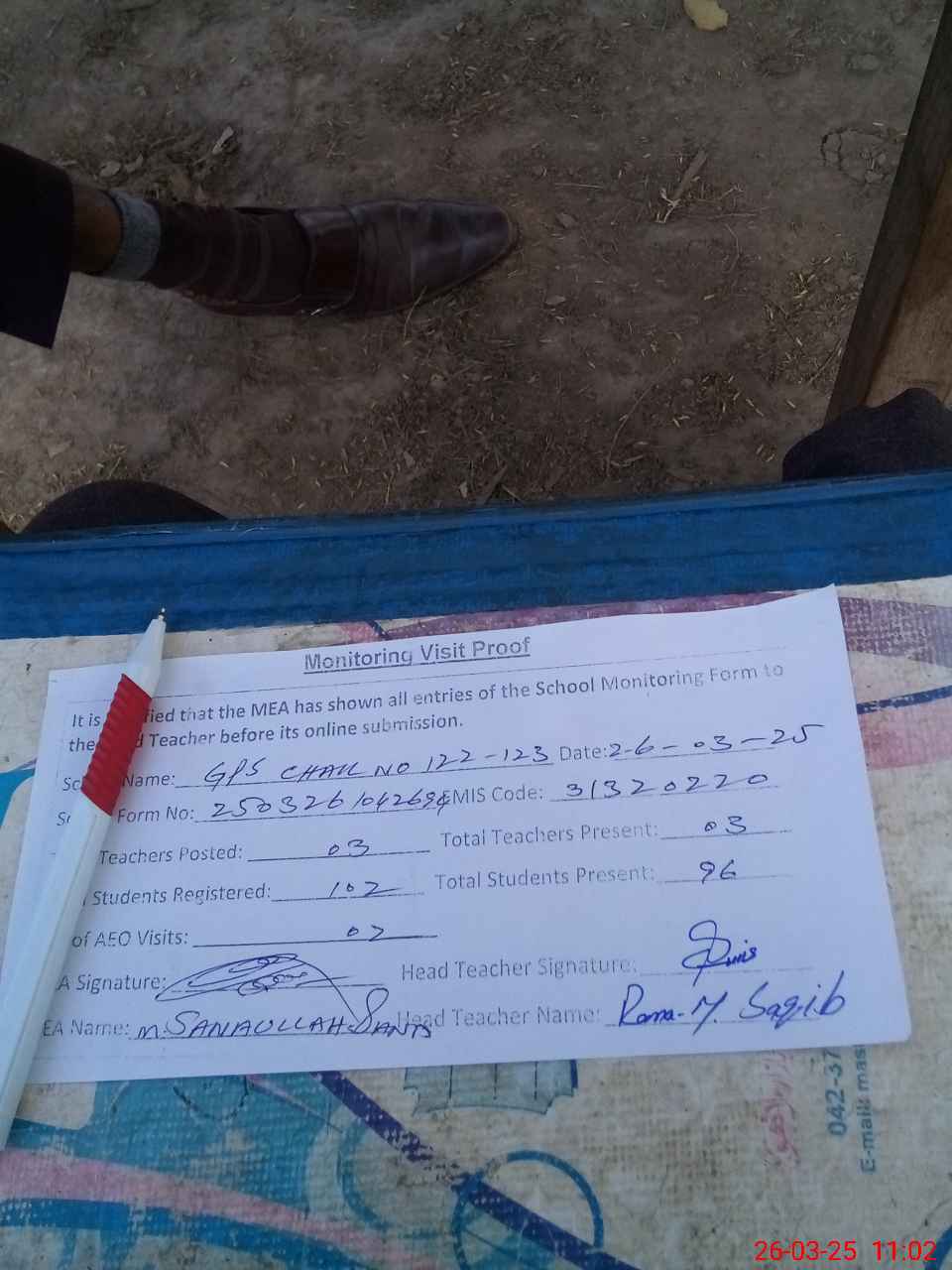 | Attendance Register | Head Teacher | MEA with School | Visit Proof |