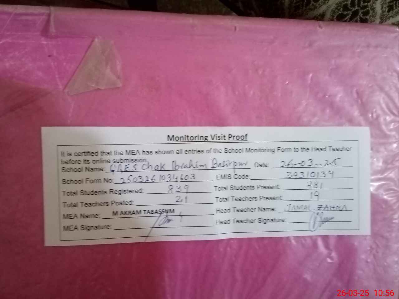 | Attendance Register | Head Teacher | MEA with School | Visit Proof |